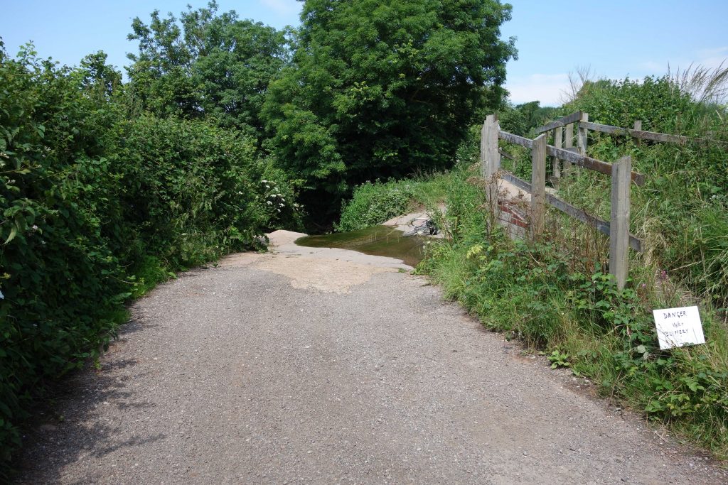 A month after kissing the concrete of this ford on Rydon Lane, Woodbury, the scout returned to see what had done for him. He had gone in the opposite direction numerous times and he remembered straightening his course as he came off the curve going this way, but the bike went from under him like he’d been on ice. The small sign was found partly hidden in the hedge at left and placed where the scout hoped others would take heed of it.