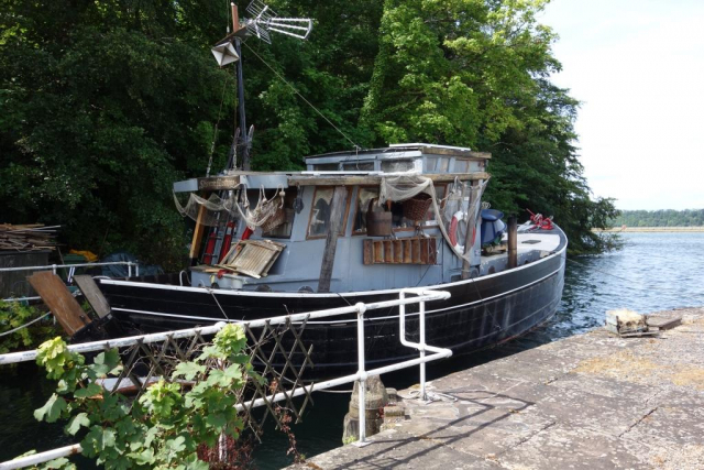 A path runs past them. The scout went down to have a look at the far end and chose a World War II ferrocement barge or lighter as a vantage point.Looking downstream from the bow of a ship built when timber was in short supply. The scout is familiar with concrete construction, because a yacht made of this material had been “berthed” on Bridford Mine while its owner worked on it on the early 1990s.