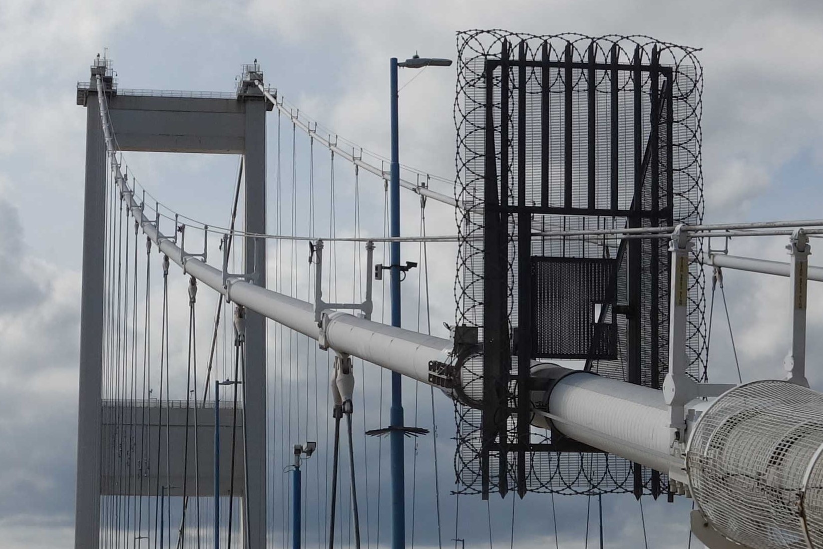 The scout has crossed the Beachley Viaduct, supported by concrete piers, and is about to climb to the first tower of Severn Bridge. He is standing on the massive cable anchorage. + The scout has always wondered whether it would be possible, with a large angle grinder, not to cut the cable, but so weaken it that the bridge would have to be closed. Perhaps it is appreciation of how vulnerable this section of cable is that it is protected by a cage. +