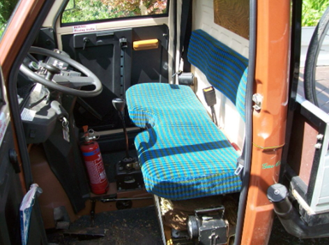 The fabric had been used in the older Piaggio, BEE 2247. Stitching it had bent the needle in the railway’s sewing machine so the recent job was given to a local vehicle trimmer, who usefully put a piece of carpet on top of the “serpentine” springs so that drivers now do not have impressions left on their hind quarters after every long run.