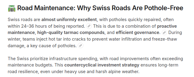 “This is entirely typical. Every single village in Switzerland of 300 people or more has an hourly bus that connects to the local railway station it meets the train at that station perfectly: the bus arrives, the train arrives and you get on the train; and in the other direction, the train arrives, you step outside and the bus is there waiting to take you to the village.”