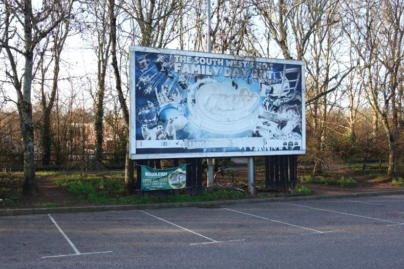 The scout has never seen another cyclist here. Behind the billboard, where the scout locks his bicycle, is a short path to Moor Lane which skirts Sowton Industrial Estate. +