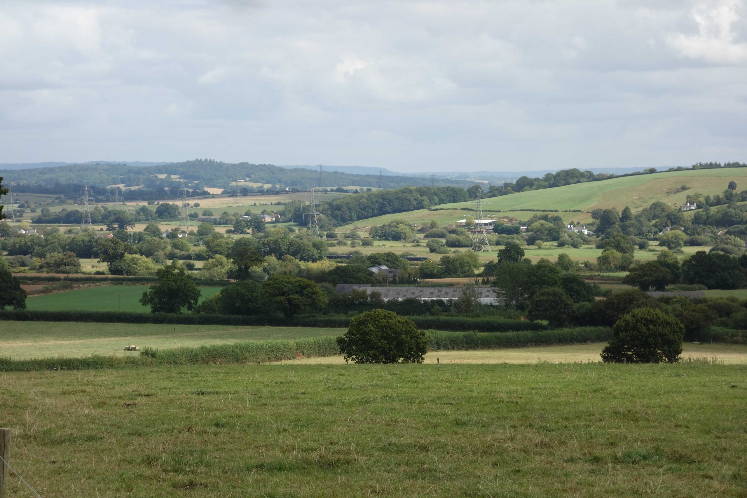 The transmitter at Whitestone pokes above the hill behind the third pylon. +