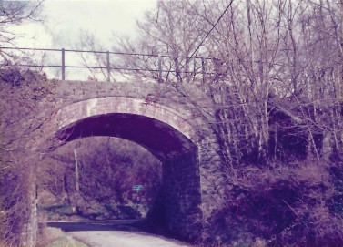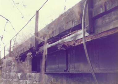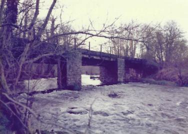 The bridge had eight spans, with two across the river. It was redundant by 1930. Not long after this photo was taken in 1979, the midstream pier was removed. The foundation for the river piers was simply sacks of dry concrete mix laid on the shale and compacted.