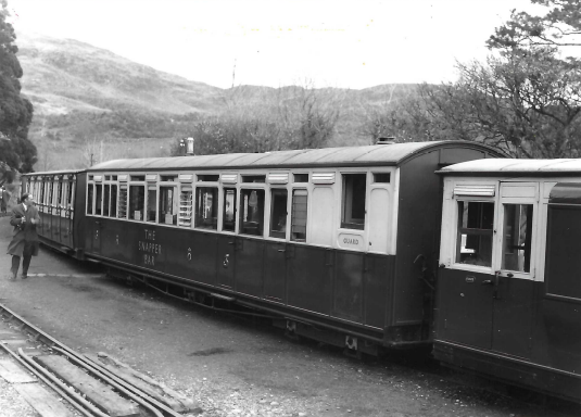 The coach seen in “Snapper,” which was recovered by the Festiniog Railway, became the “Snapper Bar,” and is seen here in North Wales.